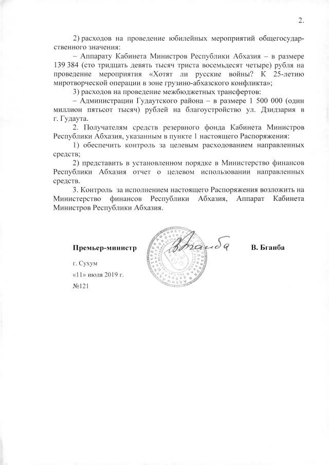 РАСПОРЯЖЕНИЕ Кабинета Министров Республики Абхазия от 11.07.2019 №121 "Об использовании средств резервного фонда Кабинета Министров Республики Абхазия"