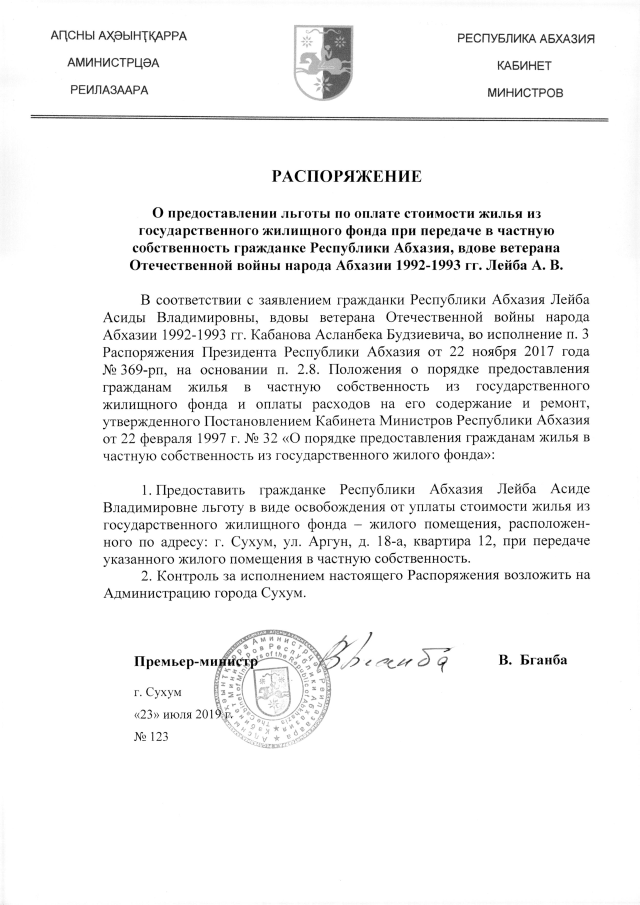 РАСПОРЯЖЕНИЕ Кабинета Министров Республики Абхазия от 23.07.2019 №123 "О предоставлении льготы по оплате стоимости жилья из государственного жилищного фонда при передаче в частную собственность гражданке Республики Абхазия, вдове ветерана Отечественной войны народа Абхазии 1992-1993 гг. Лейба А.В."