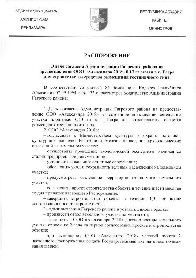 РАСПОРЯЖЕНИЕ Кабинета Министров Республики Абхазия от 24.07.2019 №125 "О даче согласия Администрации Гагрского района на предоставление ООО "Александра 2018" 0,13 га земли в г. Гагра для строительства средства размещения гостиничного типа"