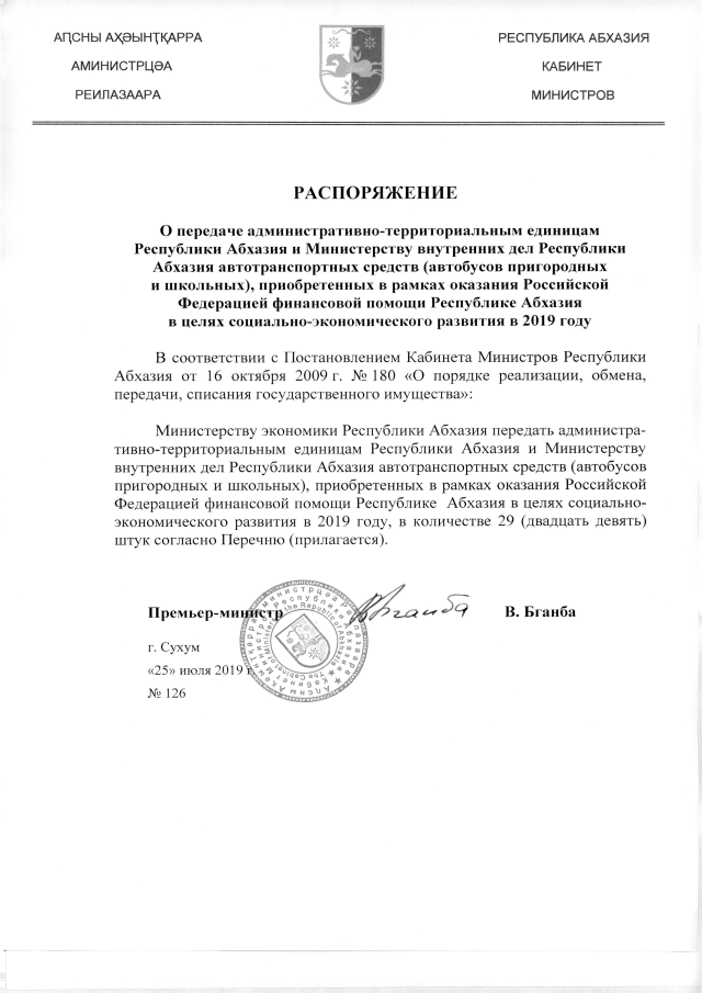 РАСПОРЯЖЕНИЕ Кабинета Министров Республики Абхазия от 25.07.2019 №126 "О передаче административно-территориальным единицам Республики Абхазия и Министерству внутренних дел Республики Абхазия автотранспортных средств (автобусов пригородных и школьных), приобретенных в рамках оказания Российской Федерацией финансовой помощи Республике Абхазия в целях социально-экономического развития в 2019 году"