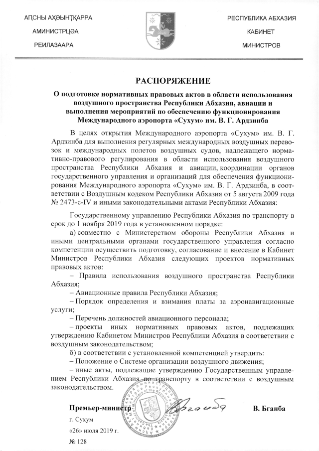РАСПОРЯЖЕНИЕ Кабинета Министров Республики Абхазия от 26.07.2019 №128 "О подготовке нормативных правовых актов в области использования воздушного пространства Республики Абхазия, авиации и выполнения мероприятий по обеспечению функционирования Международного аэропорта "Сухум" им. В.Г. Ардзинба"