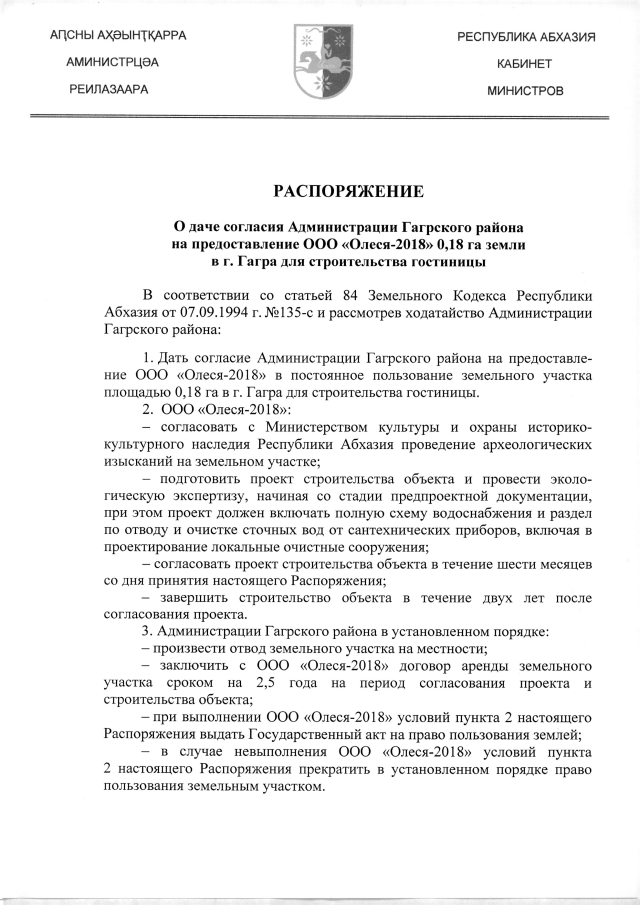 РАСПОРЯЖЕНИЕ Кабинета Министров Республики Абхазия от 31.01.2019 №13 "О даче согласия Администрации Гагрского района на предоставление ООО "Олеся-2018" 0,18 га земли в г. Гагра для строительства гостиницы"