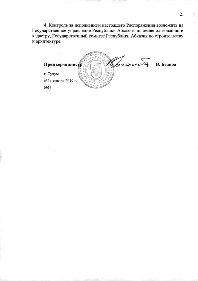 РАСПОРЯЖЕНИЕ Кабинета Министров Республики Абхазия от 31.01.2019 №13 "О даче согласия Администрации Гагрского района на предоставление ООО "Олеся-2018" 0,18 га земли в г. Гагра для строительства гостиницы"