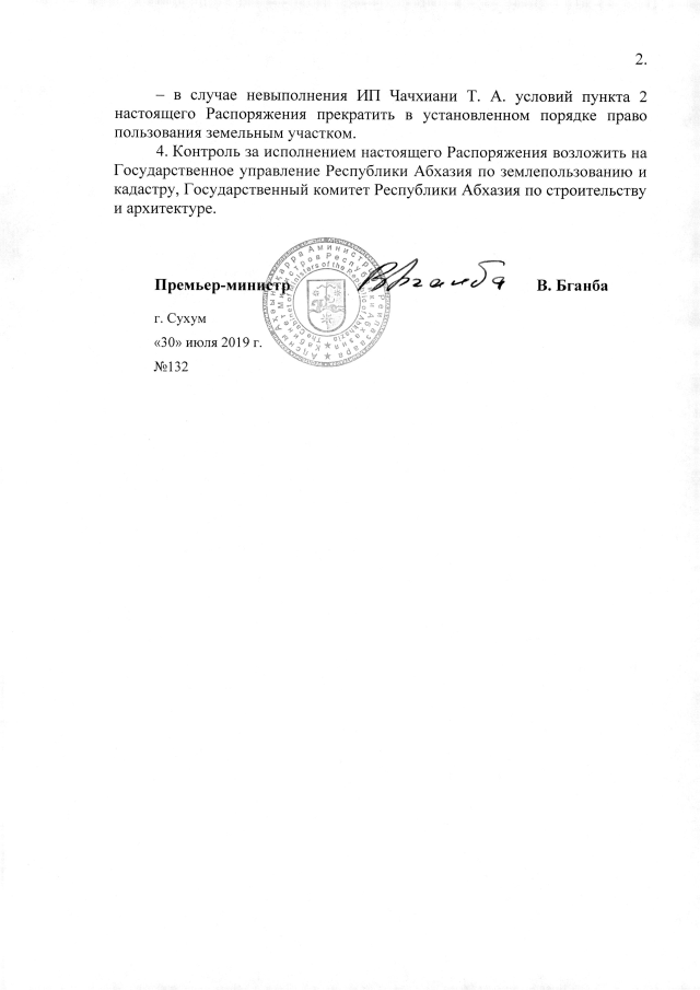 РАСПОРЯЖЕНИЕ Кабинета Министров Республики Абхазия от 30.07.2019 №132 "О даче согласия Администрации Гагрского района на предоставление ИП Чачхиани Т.А. 0,09 га земли в г. Пицунда для строительства гостиницы"