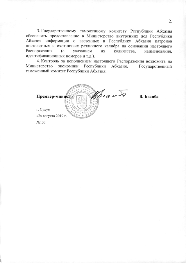 РАСПОРЯЖЕНИЕ Кабинета Министров Республики Абхазия от 02.08.2019 №133 "О выдаче ООО "Абхазский стрелковый клуб" разрешении на ввоз в Республику Абхазия патронов пистолетных и охотничьих различного калибра"