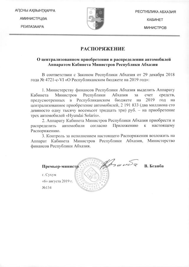 РАСПОРЯЖЕНИЕ Кабинета Министров Республики Абхазия от 06.08.2019 №134 "О централизованном приобретении и распределении автомобилей Аппаратом Кабинета Министров Республики Абхазия"