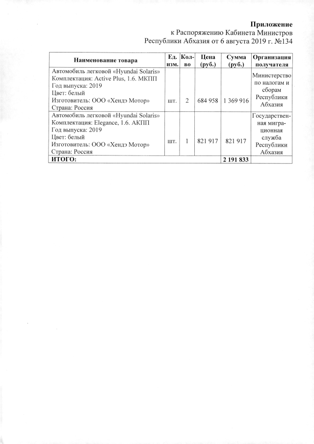 РАСПОРЯЖЕНИЕ Кабинета Министров Республики Абхазия от 06.08.2019 №134 "О централизованном приобретении и распределении автомобилей Аппаратом Кабинета Министров Республики Абхазия"