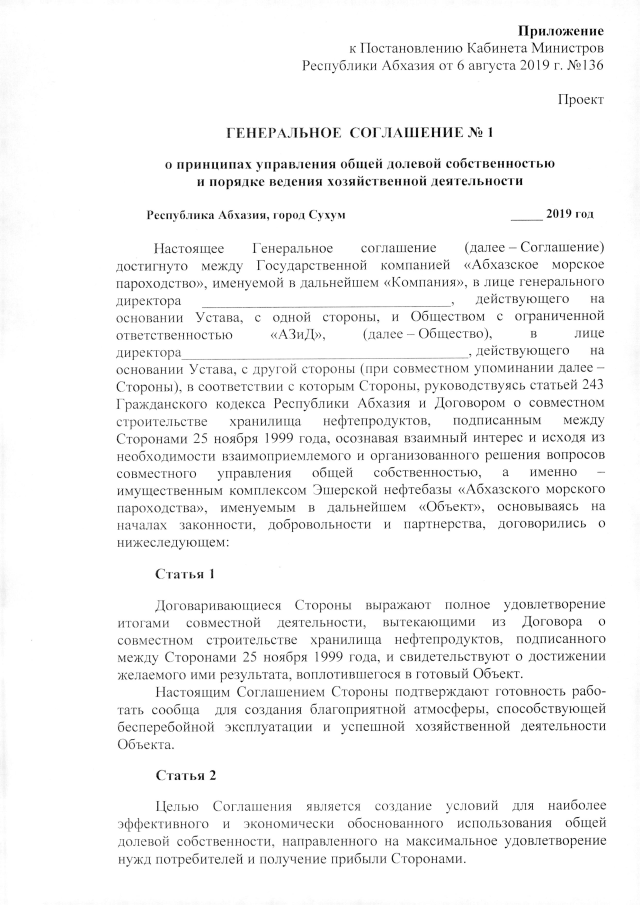РАСПОРЯЖЕНИЕ Кабинета Министров Республики Абхазия от 06.08.2019 №136 "О выдаче документов, удостоверяющих право общей собственности на имущественный комплекс Эшерской нефтебазы "Абхазского морского пароходства""