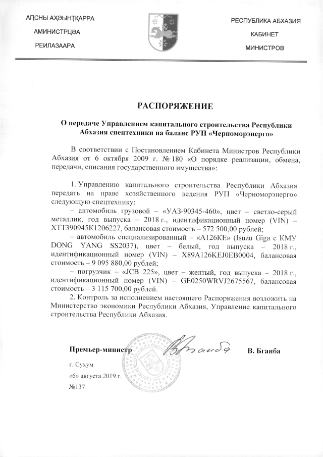 РАСПОРЯЖЕНИЕ Кабинета Министров Республики Абхазия от 06.08.2019 №137 "О передаче Управлением капитального строительства Республики Абхазия спецтехники на баланс РУП "Черноморэнерго""