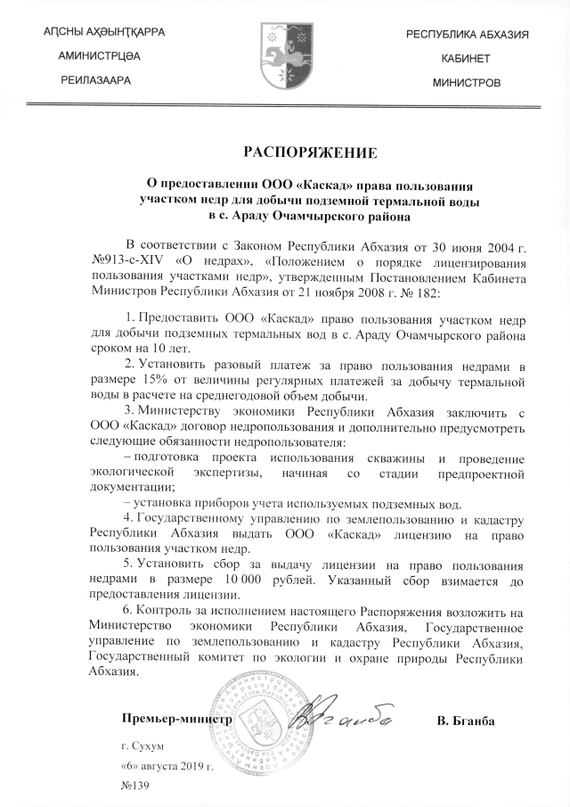РАСПОРЯЖЕНИЕ Кабинета Министров Республики Абхазия от 06.08.2019 №139 "О предоставлении ООО "Каскад" права пользования участком недр для добычи подземной термальной воды в с. Араду Очамчырского района"