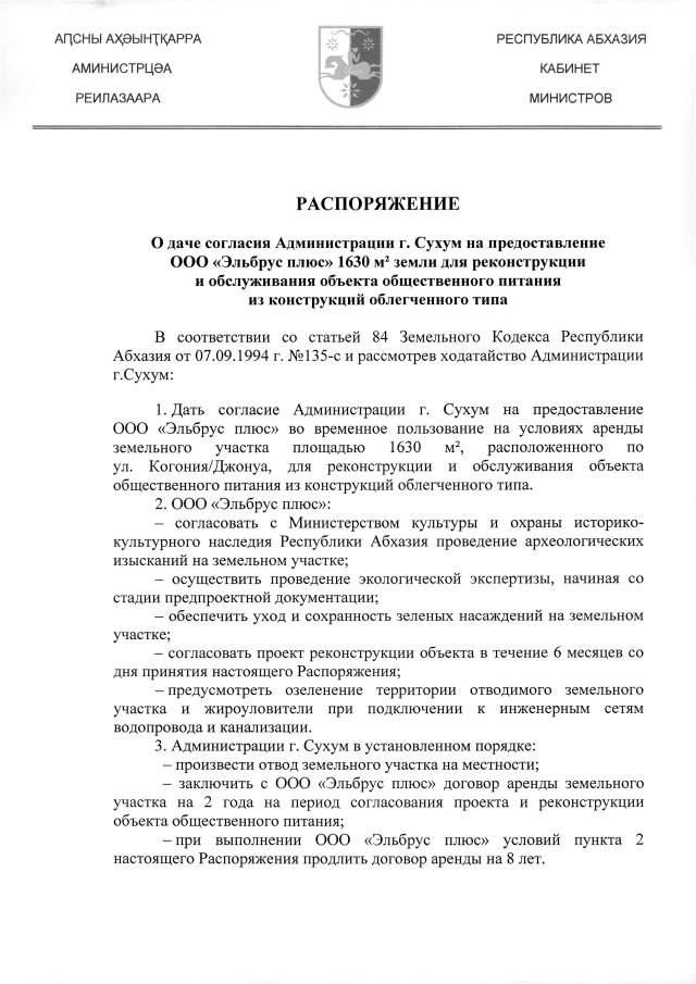 РАСПОРЯЖЕНИЕ Кабинета Министров Республики Абхазия от 31.01.2019 №14 "О даче согласия Администрации г. Сухум на предоставление ООО "Эльбрус плюс" 1630 м2 земли для реконструкции и обслуживания объекта общественного питания из конструкций облегченного типа"