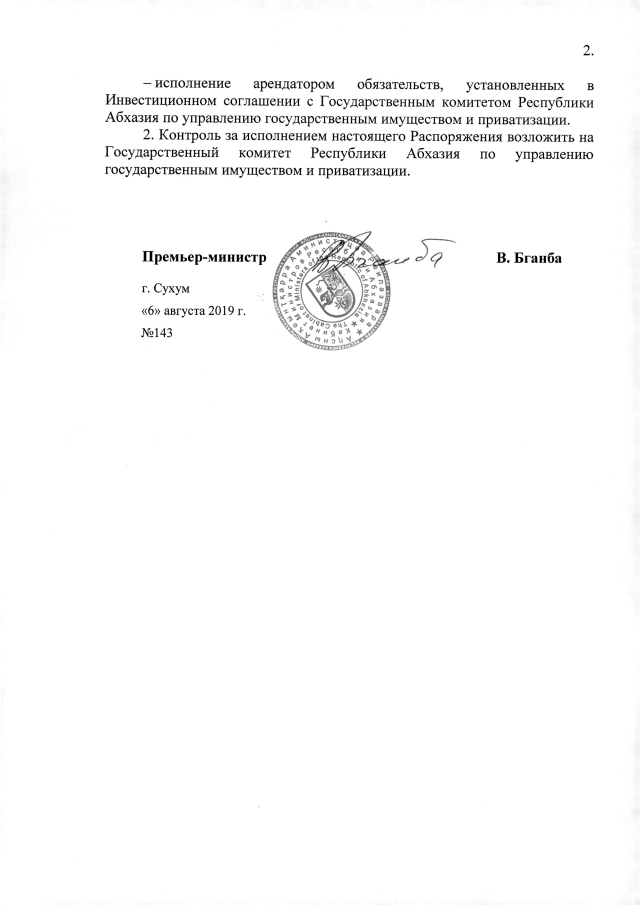 РАСПОРЯЖЕНИЕ Кабинета Министров Республики Абхазия от 06.08.2019 №143 "О передаче в аренду пансионата "Апсны" в с. Лыхны Гудаутского района"
