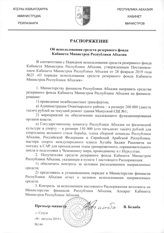 РАСПОРЯЖЕНИЕ Кабинета Министров Республики Абхазия от 08.08.2019 №144 "Об использовании средств резервного фонда Кабинета Министров Республики Абхазия"