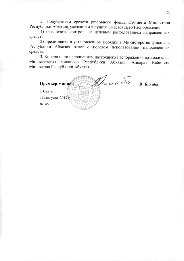 РАСПОРЯЖЕНИЕ Кабинета Министров Республики Абхазия от 09.08.2019 №145 "Об использовании средств резервного фонда Кабинета Министров Республики Абхазия"
