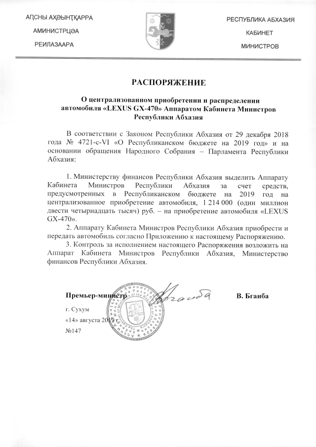 РАСПОРЯЖЕНИЕ Кабинета Министров Республики Абхазия от 14.08.2019 №147 "О централизованном приобретении и распределении автомобиля "LEXUS GX-470" Аппаратом Кабинета Министров Республики Абхазия"