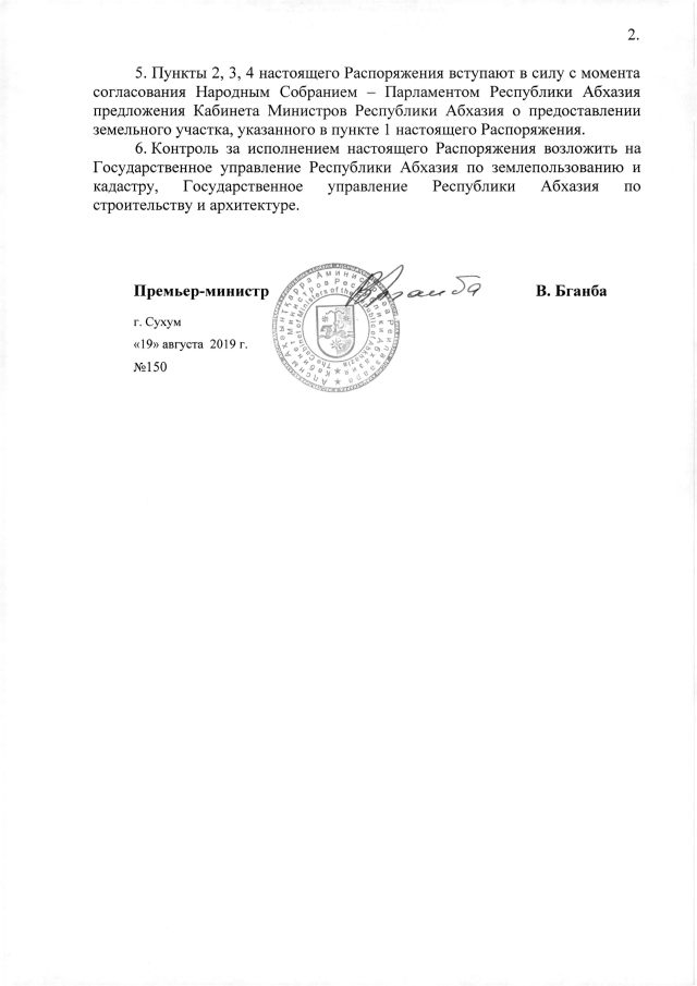 РАСПОРЯЖЕНИЕ Кабинета Министров Республики Абхазия от 19.08.2019 №150 "О предоставлении ООО "Питиус-2011" 4,10 га земли в г. Пицунда Гагрского района для строительства санаторно-курортного объекта"
