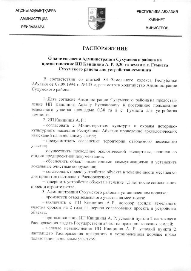РАСПОРЯЖЕНИЕ Кабинета Министров Республики Абхазия от 22.08.2019 №152 "О даче согласии Администрации Сухумского района на предоставление ИП Квициния А.Р. 0,30 га земли в с. Гумиста Сухумского района для устройства кемпинга"