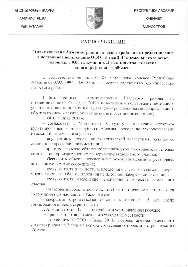 РАСПОРЯЖЕНИЕ Кабинета Министров Республики Абхазия от 23.08.2019 №155 "О даче согласия Администрации Гагрского района на предоставление в постоянное пользование ООО "Лдзаа 2011" земельного участка площадью 0,06 га земли в с. Лдзаа для строительства многопрофильного объекта"