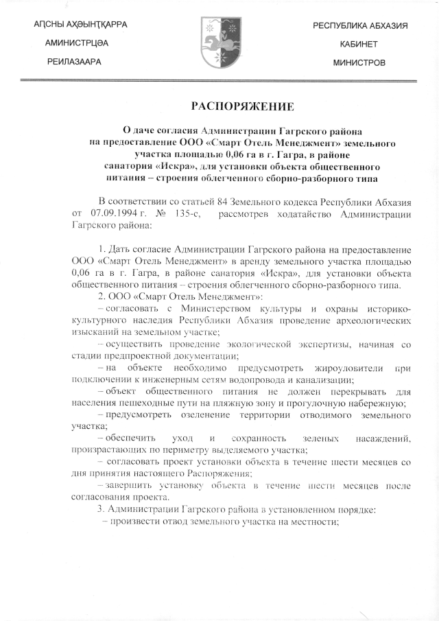 РАСПОРЯЖЕНИЕ Кабинета Министров Республики Абхазия от 23.08.2019 №157 "О даче согласия Администрации (Гагрского района на предоставление ООО "Смарт Отель Менеджмент" земельного участка площадью 0,06 га в г. Гагра, в районе санатория "Искра", для установки объекта общественного питания - строения облегченного сборно-разборного типа"