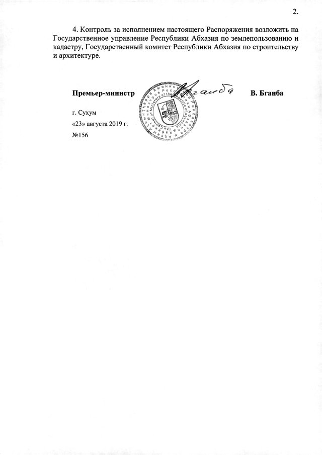 РАСПОРЯЖЕНИЕ Кабинета Министров Республики Абхазия от 23.08.2019 №156 "О даче согласия Администрации Гагрского района на предоставление ИП Капба Н.Т. земельного участка площадью 0,02 га земли в г. Гагра, пр. В. Ардзинба, для установки объекта общественного питания - строения облегченного сборно-разборного типа"