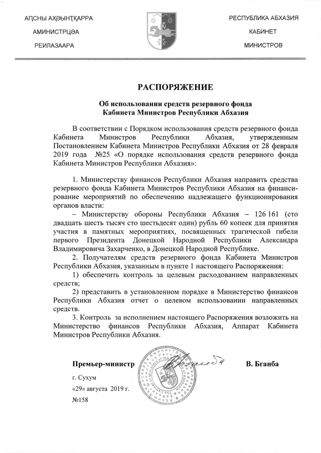 РАСПОРЯЖЕНИЕ Кабинета Министров Республики Абхазия от 29.08.2019 №158 "Об использовании средств резервного фонда Кабинета Министров Республики Абхазия"