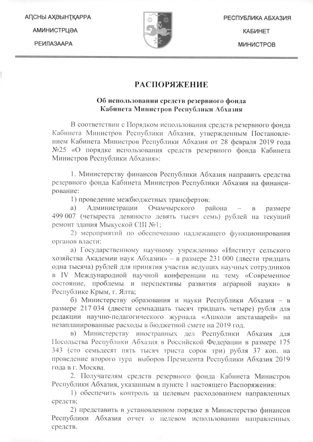 РАСПОРЯЖЕНИЕ Кабинета Министров Республики Абхазия от 30.08.2019 №159 "Об использовании средств резервного фонда Кабинета Министров Республики Абхазия"