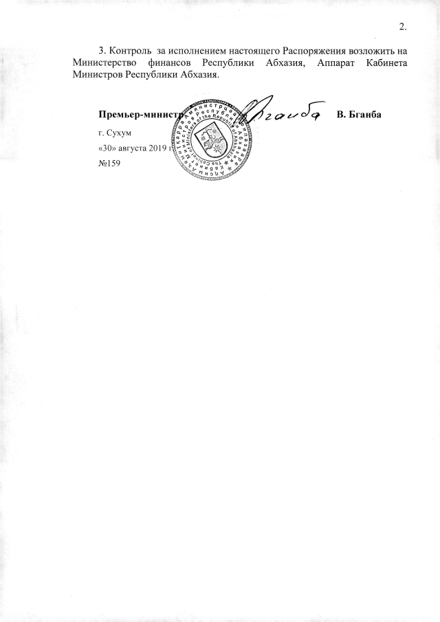 РАСПОРЯЖЕНИЕ Кабинета Министров Республики Абхазия от 30.08.2019 №159 "Об использовании средств резервного фонда Кабинета Министров Республики Абхазия"