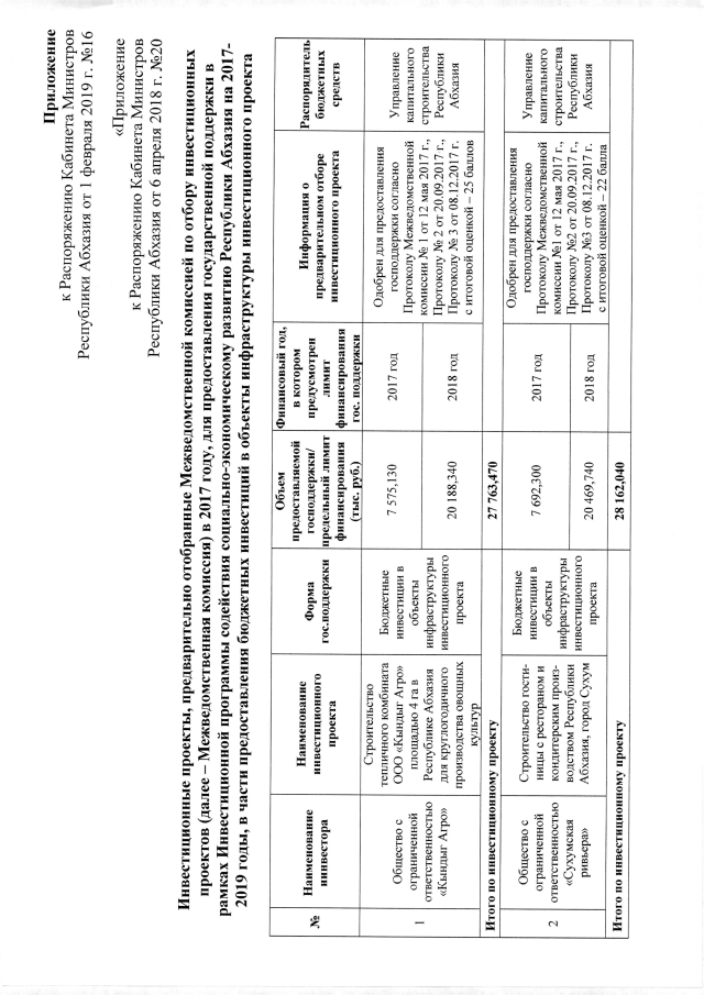 РАСПОРЯЖЕНИЕ Кабинета Министров Республики Абхазия от 01.02.2019 №16 "О внесении изменения в Распоряжение Кабинета Министров Республики Абхазия от 6 апреля 2018 года №20 "Об утверждении инвестиционных проектов, предварительно отобранных Межведомственной комиссией по отбору инвестиционных проектов в 2017 году, для предоставления государственной поддержки в рамках Инвестиционной программы содействия социально-экономическому развитию Республики Абхазия на 2017-2019 годы, в части предоставления бюджетных инвестиций в объекты инфраструктуры инвестиционного проекта""