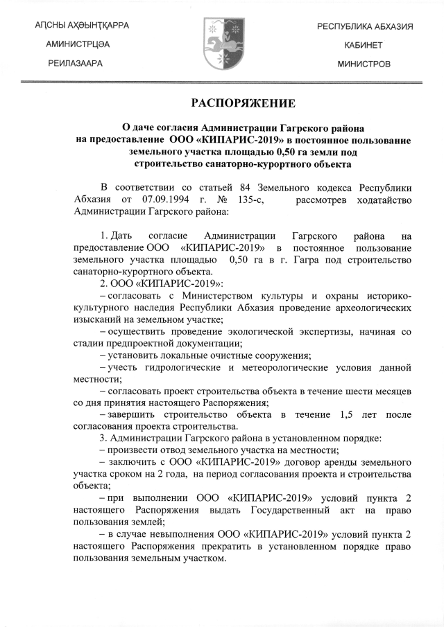 РАСПОРЯЖЕНИЕ Кабинета Министров Республики Абхазия от 03.09.2019 №160 "О даче согласия Администрации Гагрского района на предоставление ООО "КИПАРИС-2019" в постоянное пользование земельного участка площадью 0,50 га земли под строительство санаторно-курортного объекта"