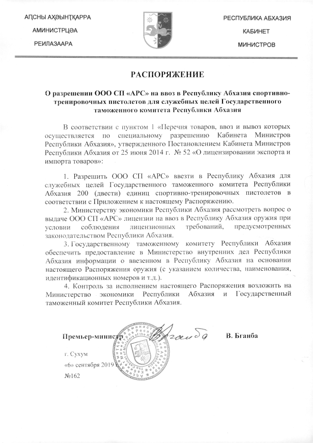 РАСПОРЯЖЕНИЕ Кабинета Министров Республики Абхазия от 06.09.2019 №162 "О разрешении ООО СП "АРС" на ввоз в Республику Абхазия спортивно-тренировочных пистолетов для служебных целей Государственного таможенного комитета Республики Абхазия"