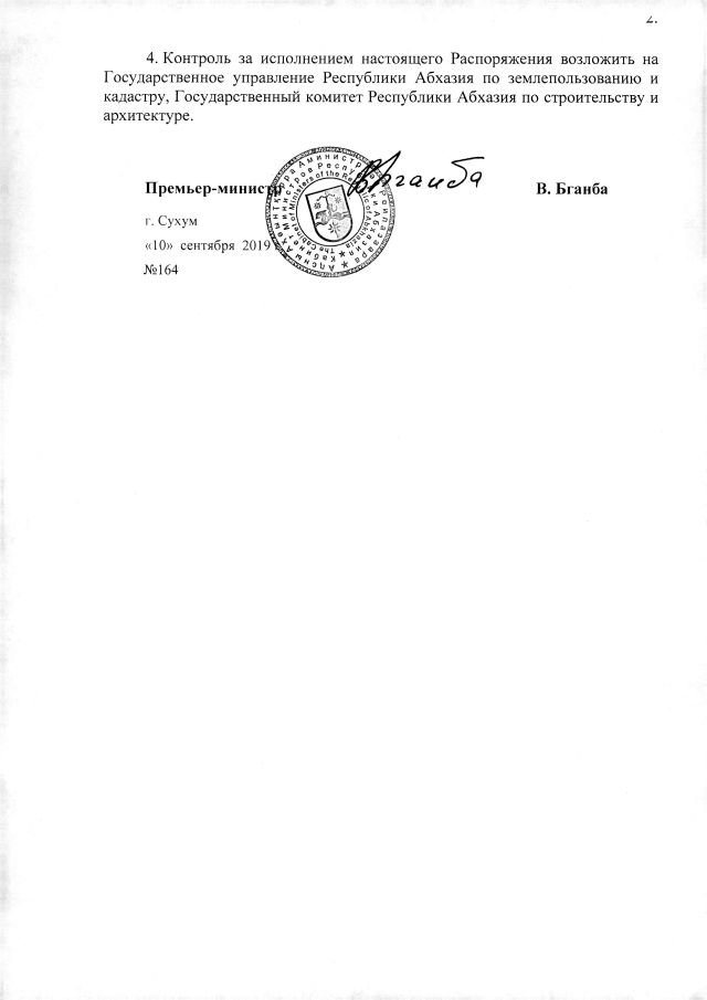 РАСПОРЯЖЕНИЕ Кабинета Министров Республики Абхазия от 10.09.2019 №164 "О даче согласия Администрации Гагрского района на предоставление ИП Капш Н.М. 0,48 га земли в с. Алахадзы для устройства кемпинга"