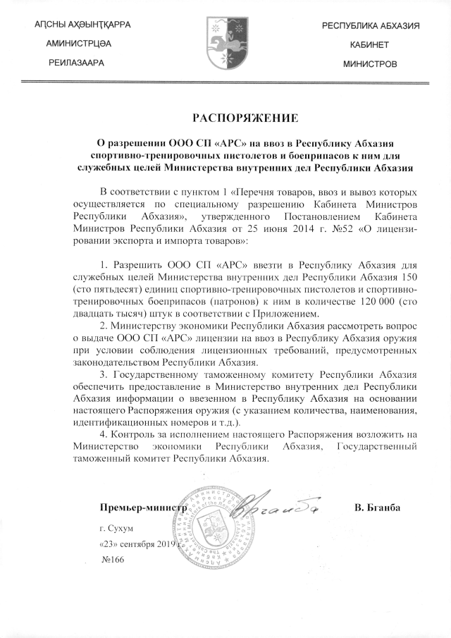 РАСПОРЯЖЕНИЕ Кабинета Министров Республики Абхазия от 23.09.2019 №166 "О разрешении ООО СП "АРС" на ввоз в Республику Абхазия спортивно-тренировочных пистолетов и боеприпасов к ним дли служебных целей Министерства внутренних дел Республики Абхазия"