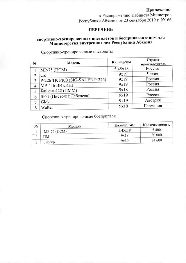 РАСПОРЯЖЕНИЕ Кабинета Министров Республики Абхазия от 23.09.2019 №166 "О разрешении ООО СП "АРС" на ввоз в Республику Абхазия спортивно-тренировочных пистолетов и боеприпасов к ним дли служебных целей Министерства внутренних дел Республики Абхазия"