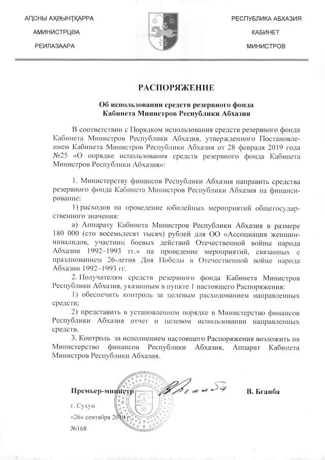 РАСПОРЯЖЕНИЕ Кабинета Министров Республики Абхазия от 26.09.2019 №168 "Об использовании средств резервною фонда Кабинета Министров Республики Абхазии"