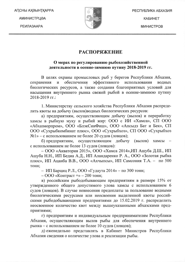 РАСПОРЯЖЕНИЕ Кабинета Министров Республики Абхазия от 08.02.2019 №17 "О мерах по регулированию рыбохозяйственной деятельности в осенне-зимнюю путину 2018-2019 гг."