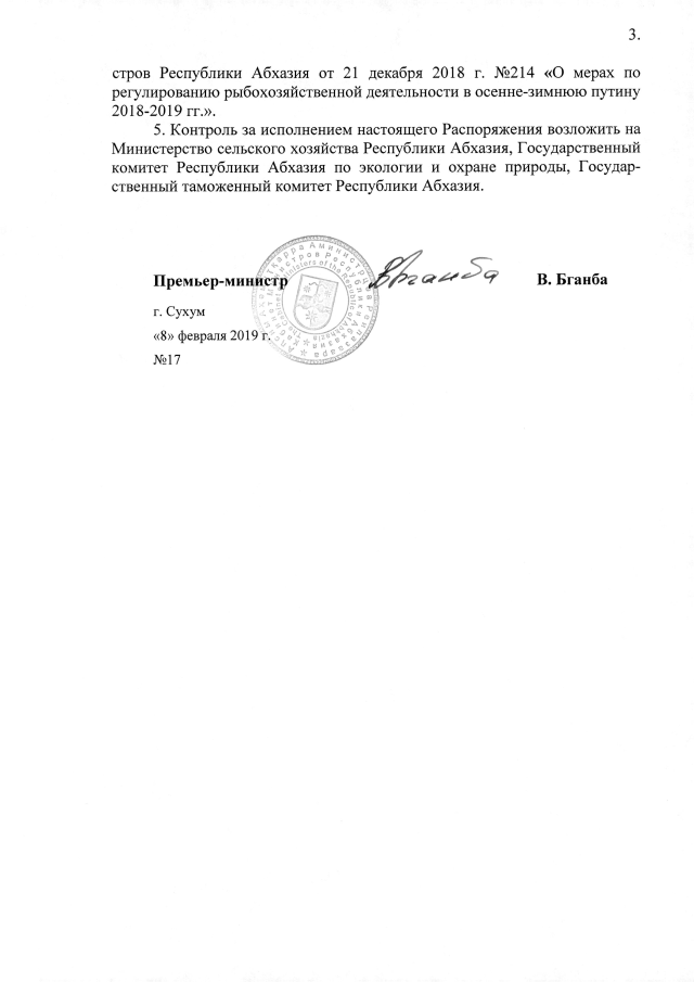 РАСПОРЯЖЕНИЕ Кабинета Министров Республики Абхазия от 08.02.2019 №17 "О мерах по регулированию рыбохозяйственной деятельности в осенне-зимнюю путину 2018-2019 гг."