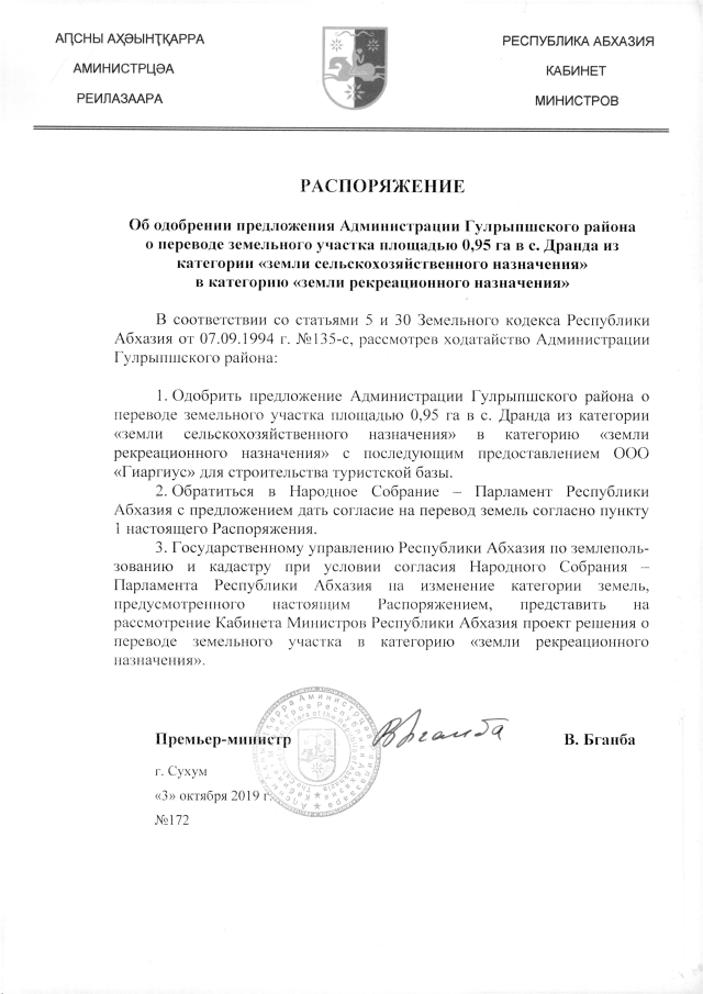 РАСПОРЯЖЕНИЕ Кабинета Министров Республики Абхазия от 03.10.2019 №172 "Об одобрении предложения Администрации Гулрыпшского района о переводе земельною участка площадью 0,95 га в с. Дранда из категории "земли сельскохозяйственного назначения" в категорию "земли рекреационного назначения""