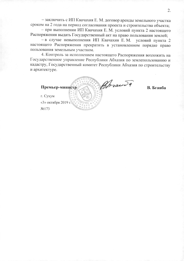 РАСПОРЯЖЕНИЕ Кабинета Министров Республики Абхазия от 03.10.2019 №173 "О переводе земельного участка площадью 0,70 га в с. Бабышира Гулрыпшского района из категории "земли сельскохозяйственного назначения" в категорию "земли населенных пунктов" для предоставления ИП Квачахия Е.М. под строительство санаторно-курортного объекта"