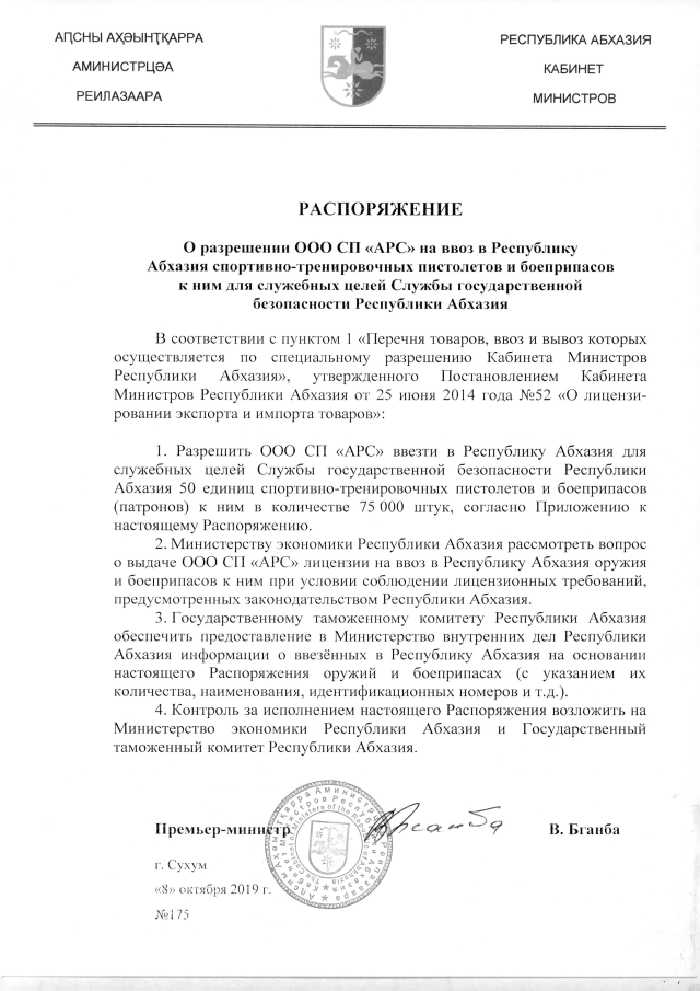 РАСПОРЯЖЕНИЕ Кабинета Министров Республики Абхазия от 08.10.2019 №175 "О разрешении ООО СП "АРС" на ввоз в Республику Абхазия спортивно-тренировочных пистолетов и боеприпасов к ним для служебных целей Службы государственной безопасности Республики Абхазия"