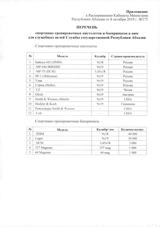 РАСПОРЯЖЕНИЕ Кабинета Министров Республики Абхазия от 08.10.2019 №175 "О разрешении ООО СП "АРС" на ввоз в Республику Абхазия спортивно-тренировочных пистолетов и боеприпасов к ним для служебных целей Службы государственной безопасности Республики Абхазия"