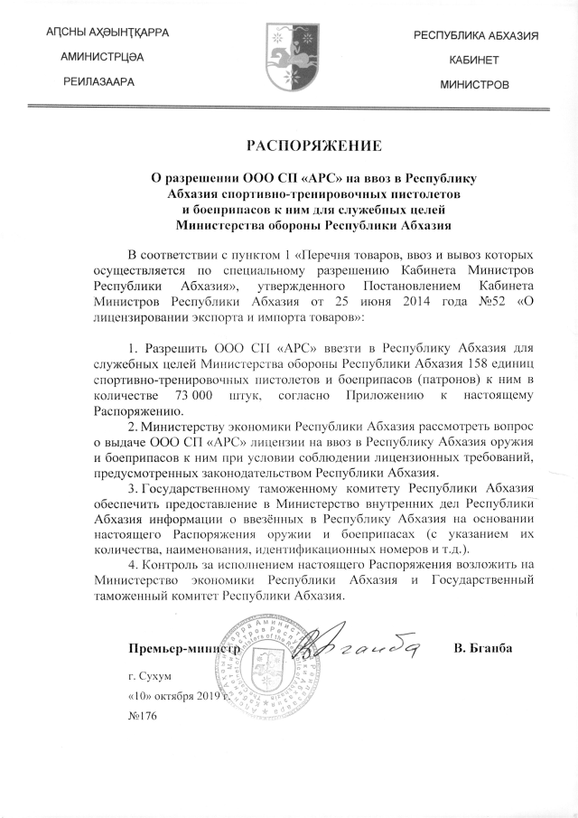 РАСПОРЯЖЕНИЕ Кабинета Министров Республики Абхазия от 10.10.2019 №176 "О разрешении ООО СП "АРС" на ввоз в Республику Абхазия спортивно-тренировочных пистолетов и боеприпасов к ним для служебных целей Министерства обороны Республики Абхазия"