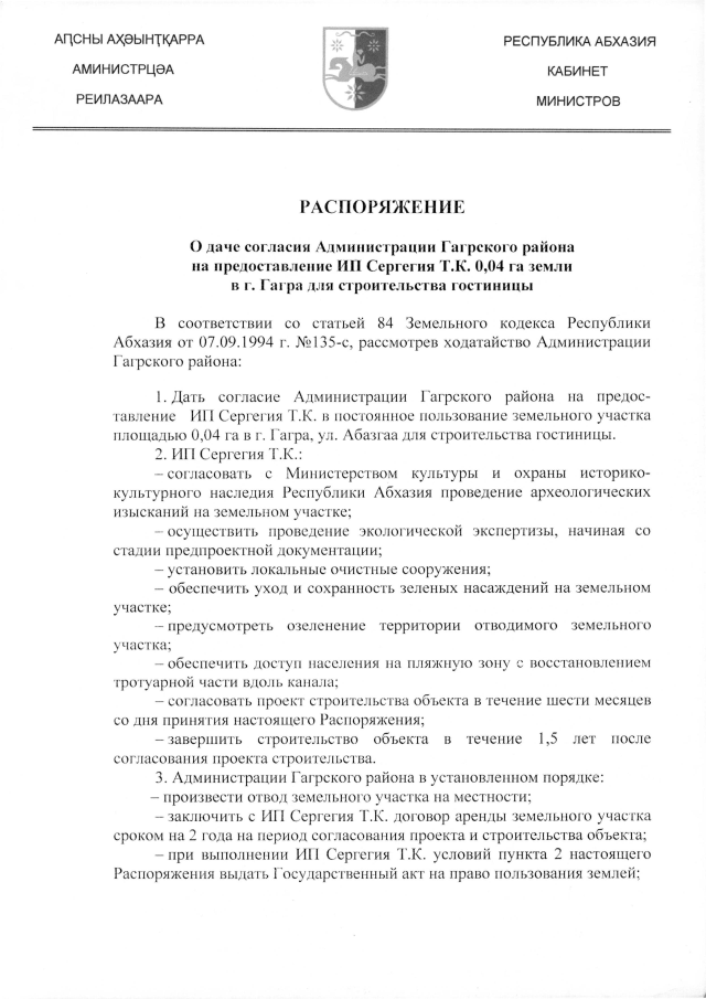 РАСПОРЯЖЕНИЕ Кабинета Министров Республики Абхазия от 17.10.2019 №179 "О даче согласии Администрации Гагрского района на предоставление ИП Сергегия Т.К. 0,04 га земли в г. Гагра для строительства гостиницы"