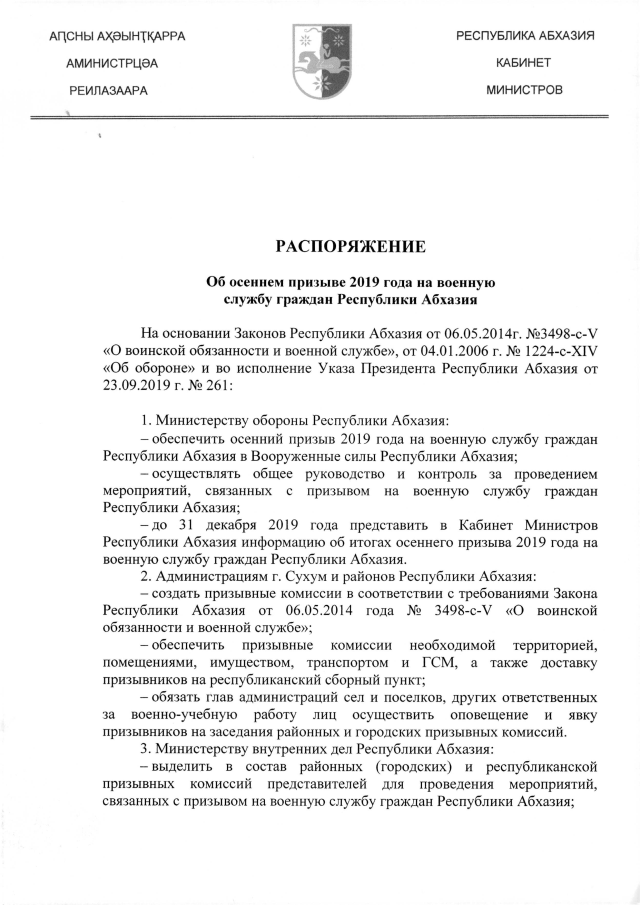 РАСПОРЯЖЕНИЕ Кабинета Министров Республики Абхазия от 21.10.2019 №185 "Об осеннем призыве 2019 года на военную службу граждан Республики Абхазия"