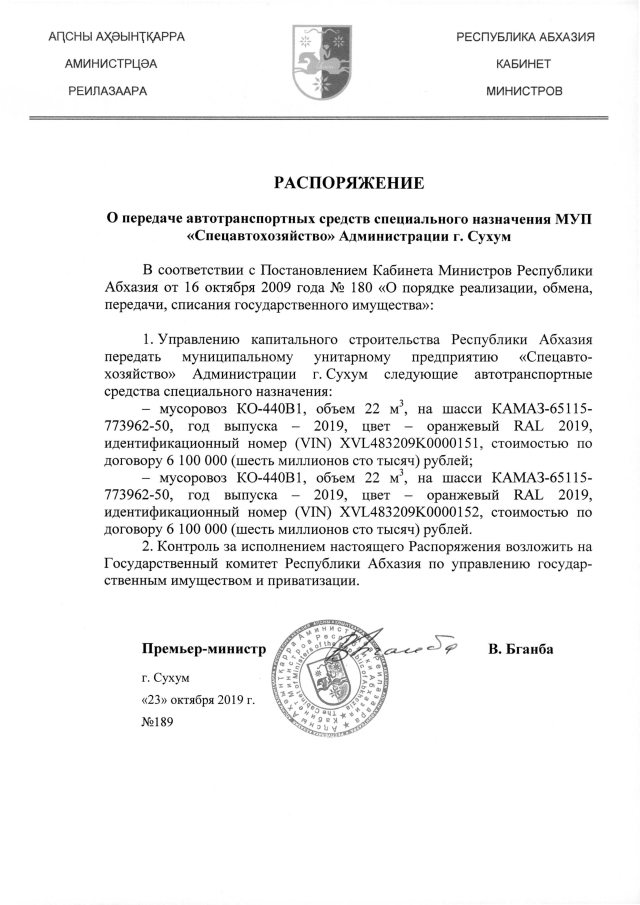 РАСПОРЯЖЕНИЕ Кабинета Министров Республики Абхазия от 23.10.2019 №189 "О передаче автотранспортных средств специального назначения МУП "Спецавтохозяйство" Администрации г. Сухум"