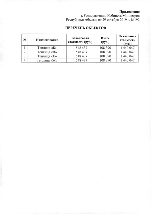 РАСПОРЯЖЕНИЕ Кабинета Министров Республики Абхазия от 29.10.2019 №192 "О списании теплиц из состава имущественного комплекса "Пицундское подсобное хозяйство" Министерства по курортам и туризму Республики Абхазия"