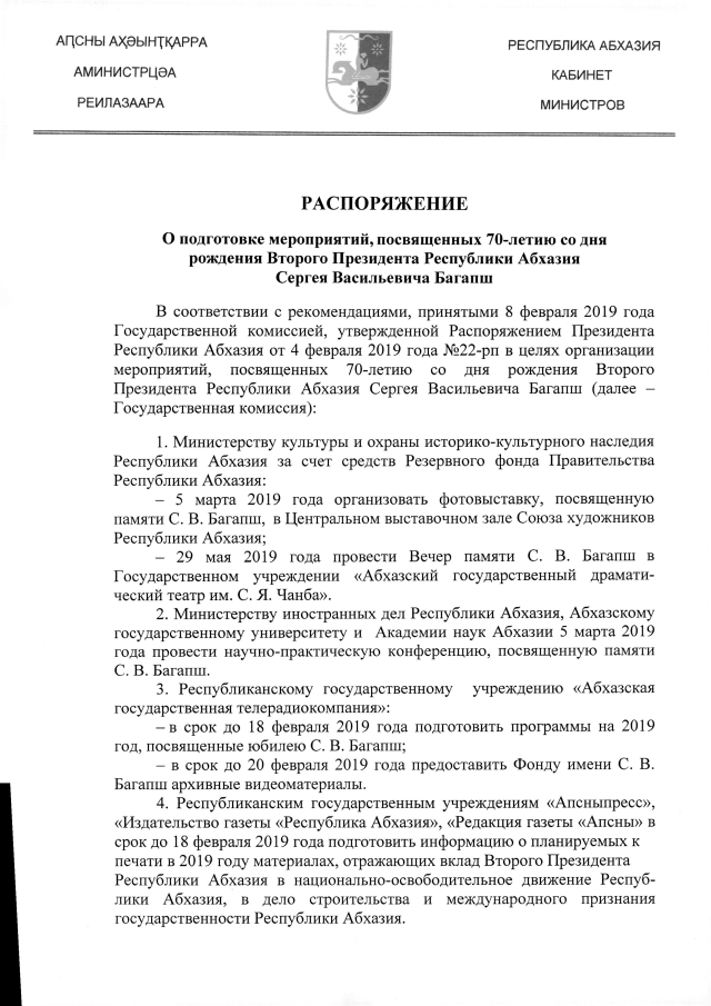 РАСПОРЯЖЕНИЕ Кабинета Министров Республики Абхазия от 13.02.2019 №20 "О подготовке мероприятий, посвященных 70-летию со дня рождения Второго Президента Республики Абхазия Сергея Васильевича Багапш"