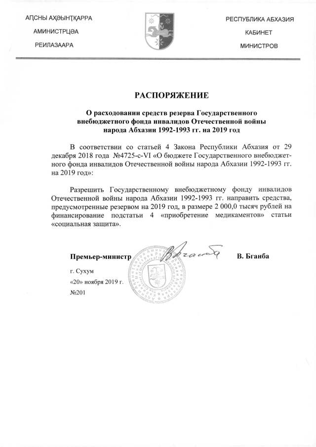 РАСПОРЯЖЕНИЕ Кабинета Министров Республики Абхазия от 20.11.2019 №201 "О расходовании средств резерва Государственного внебюджетного фонда инвалидов Отечественной войны народа Абхазии 1992-1993 гг. на 2019 год"
