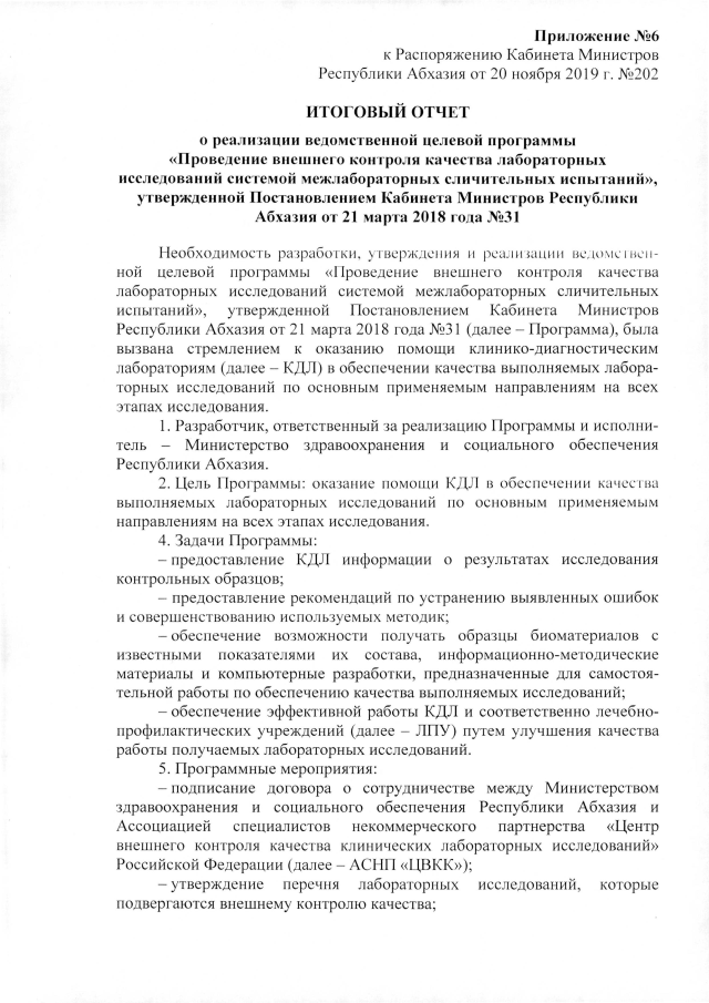 РАСПОРЯЖЕНИЕ Кабинета Министров Республики Абхазия от 20.11.2019 №202 "Об итоговых отчетах о реализации ведомственных целевых программ Министерства здравоохранении и социального обеспечения Республики Абхазии, принятых на 2018 год"