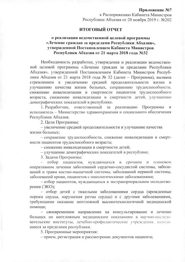 РАСПОРЯЖЕНИЕ Кабинета Министров Республики Абхазия от 20.11.2019 №202 "Об итоговых отчетах о реализации ведомственных целевых программ Министерства здравоохранении и социального обеспечения Республики Абхазии, принятых на 2018 год"