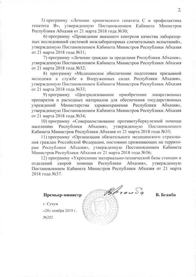 РАСПОРЯЖЕНИЕ Кабинета Министров Республики Абхазия от 20.11.2019 №202 "Об итоговых отчетах о реализации ведомственных целевых программ Министерства здравоохранении и социального обеспечения Республики Абхазии, принятых на 2018 год"